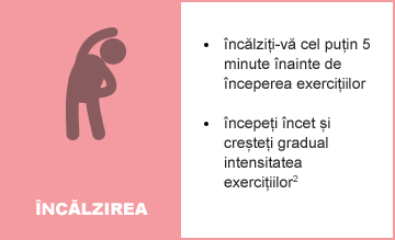 Informația și exercițiile fizice prezentate în acest material au un caracter informativ și nu înlocuiesc consultul medical de specialitate. Înainte de a începe un program de exerciții fizice specializate este important să discutați cu medicul dumneavoastră pentru a stabili eventualele limite cauzate de afecțiunile concomitente pe care le aveți și pe care organismul dumneavoastră nu trebuie să le depășească.4