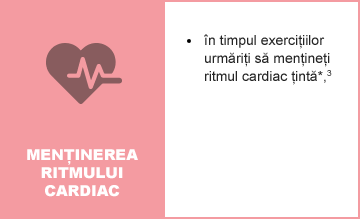* Pentru a afla ritmul cardiac maxim în condiții de siguranță, scădeți vârsta dumneavoastră din 220. Ritmul cardiac țintă reprezintă între 70 și 90% din maximum. Pentru a afla ritmul cardiac țintă, vă puteți folosi în scop orientativ și de tabelul de mai jos. Pentru a vă măsura ritmul cardiac (pulsul), apăsați partea inferioară a încheieturii mâinii cu buricele degetelor de la cealaltă mână. Număraţi bătăile inimii în decursul a 15 secunde și înmulțiți cu 4, în cazul în care aveţi pulsul regulat, pentru a afla pulsul pe minut. Alternativ, puteți folosi o centură de măsurare a ritmului cardiac pentru a vă monitoriza în timp real bătăile inimii.