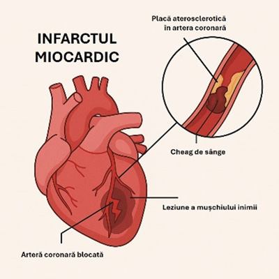 Infarctul miocardic apare atunci când o arteră coronară, care transportă sânge cu oxigen către inimă, se blochează din cauza unor depuneri de colesterol (plăci de aterom). Astfel de depuneri pot fi prezente și în alte vase din organism (creier, rinichi, intestin, membre).